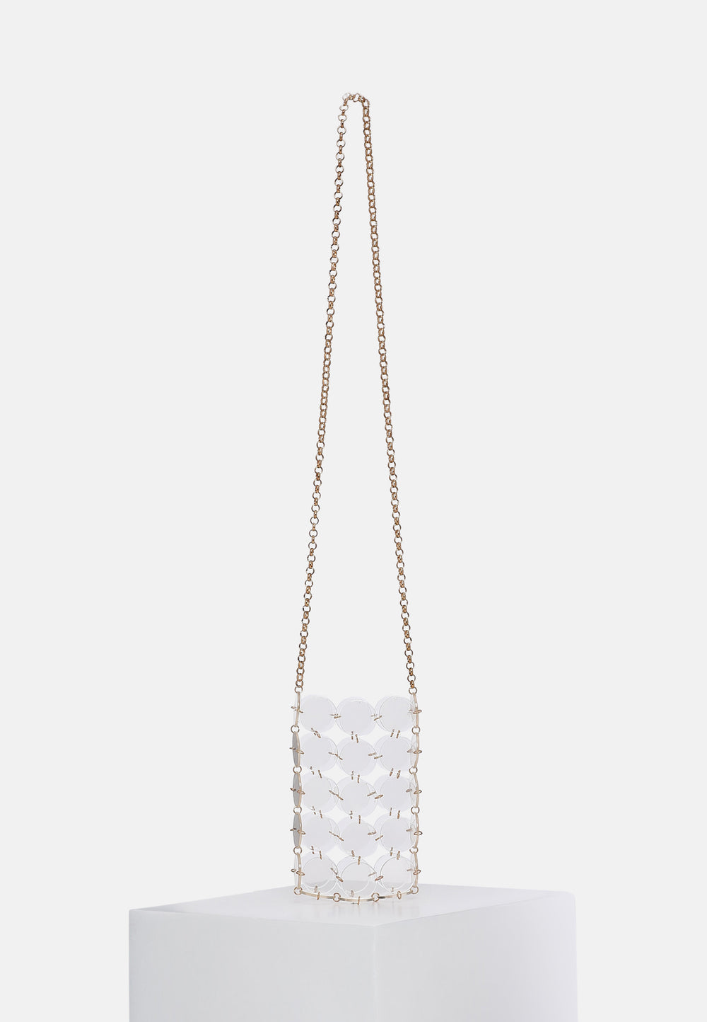 The Glam Petite Sac boasts a modern and dazzling construction, meticulously adorned with transparent disc-shaped acrylic sequins, creating a radiant and scintillating effect that catches the light with every step. The interwoven chainmail design adds a touch of sophistication and allure, making it a standout piece that complements any outfit for both daytime gatherings and lively nights on the dance floor.