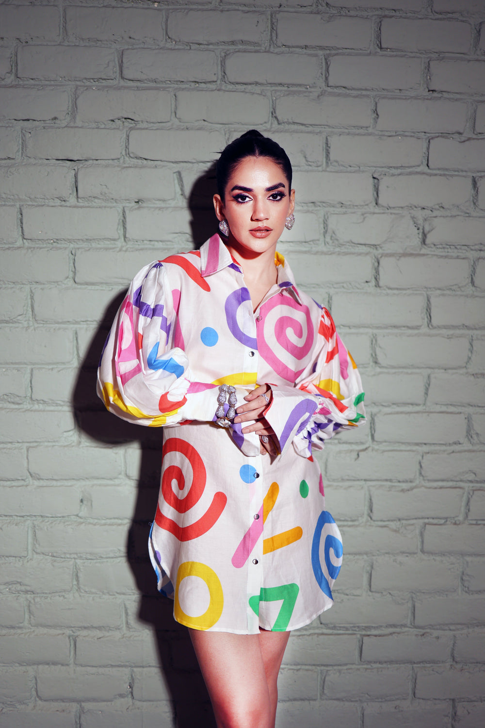 Flaunt the squiggle wiggle print on this fancy shirt dress with exaggerated sleeves and a button-up front.