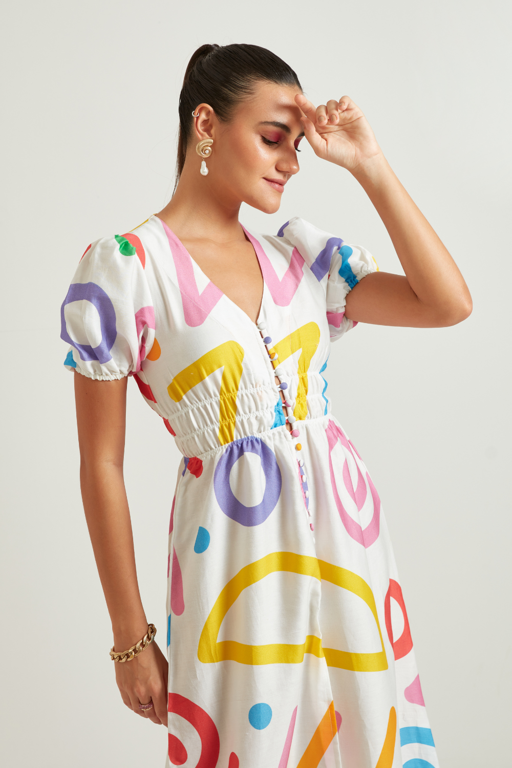 A squiggle wiggle print maxi dress featuring short puff sleeves and a button-up front with a slit.