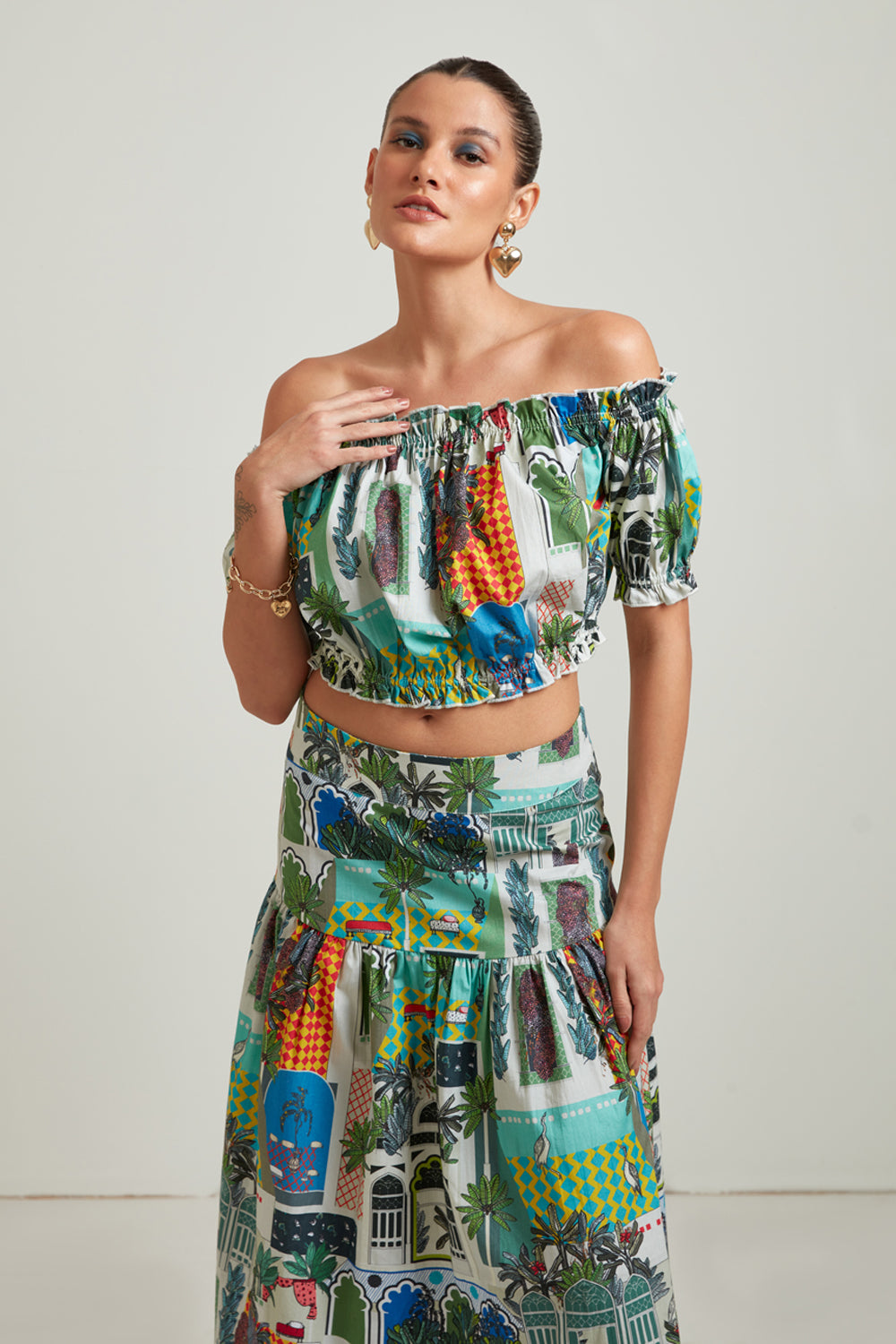 A snazzy co-ord set featuring an off-shoulder crop top paired with a midi skirt.