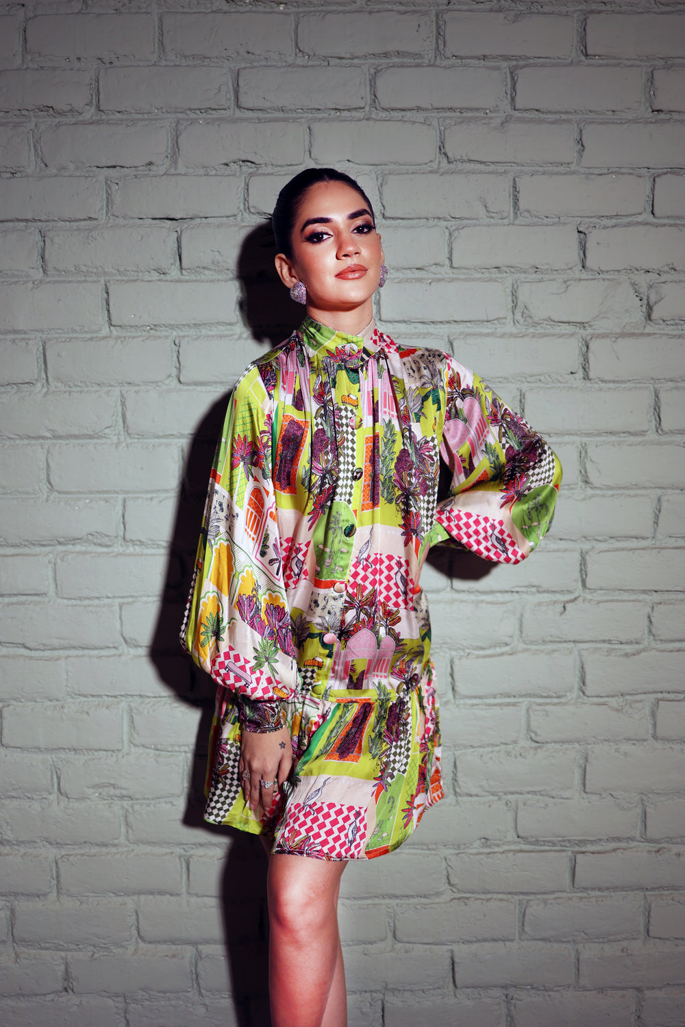 A collared short dress featuring long sleeves, a ruffled hem and a button-up front. The outfit can be made with a matching belt upon request.