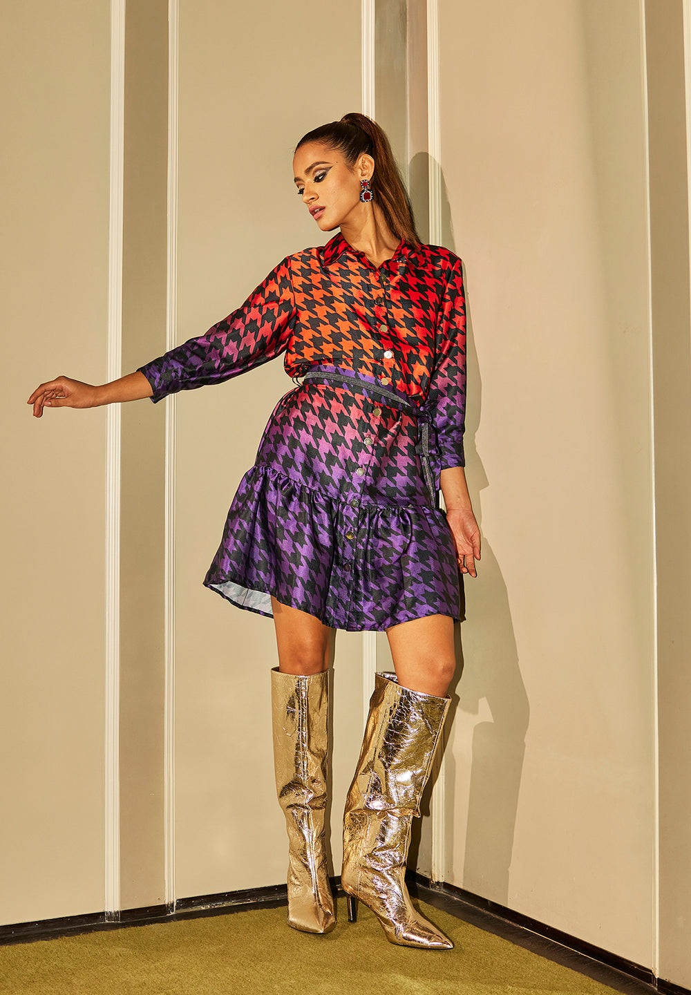 A timeless skater dress in a flattering & feminine silhouette, that is playful, chic & just the right amount of sexy. It is designed to highlight your waist and accentuate your curves, adding that bit of oomph! Features in our exclusive houndstooth print © in an ombre effect of purple haze with crimson red.