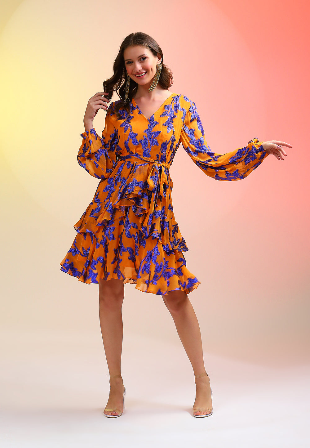 The 'Santorini Sunset' dress features a captivating combination of tangerine and cobalt tones, mirroring the vibrant hues that adorn the city's architectural gems and the breathtaking sunset views. The dichromatic colour palette instantly catches the eye, creating a bold and captivating look. Crafted from lightweight and flowing georgette fabric, this dress drapes gracefully, offering a comfortable and elegant fit. The metallic lurex detail print adds a touch of glamour, creating a shimmering effect that enhances the dress's allure. Each movement captures the light, making you shine like the Santorini sun.