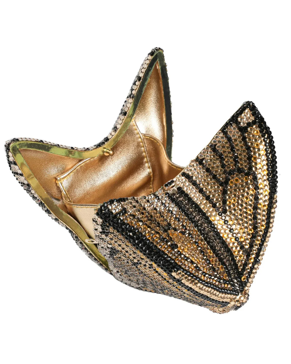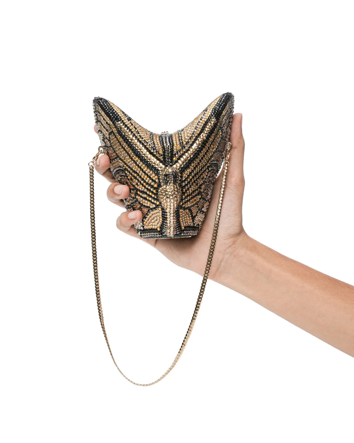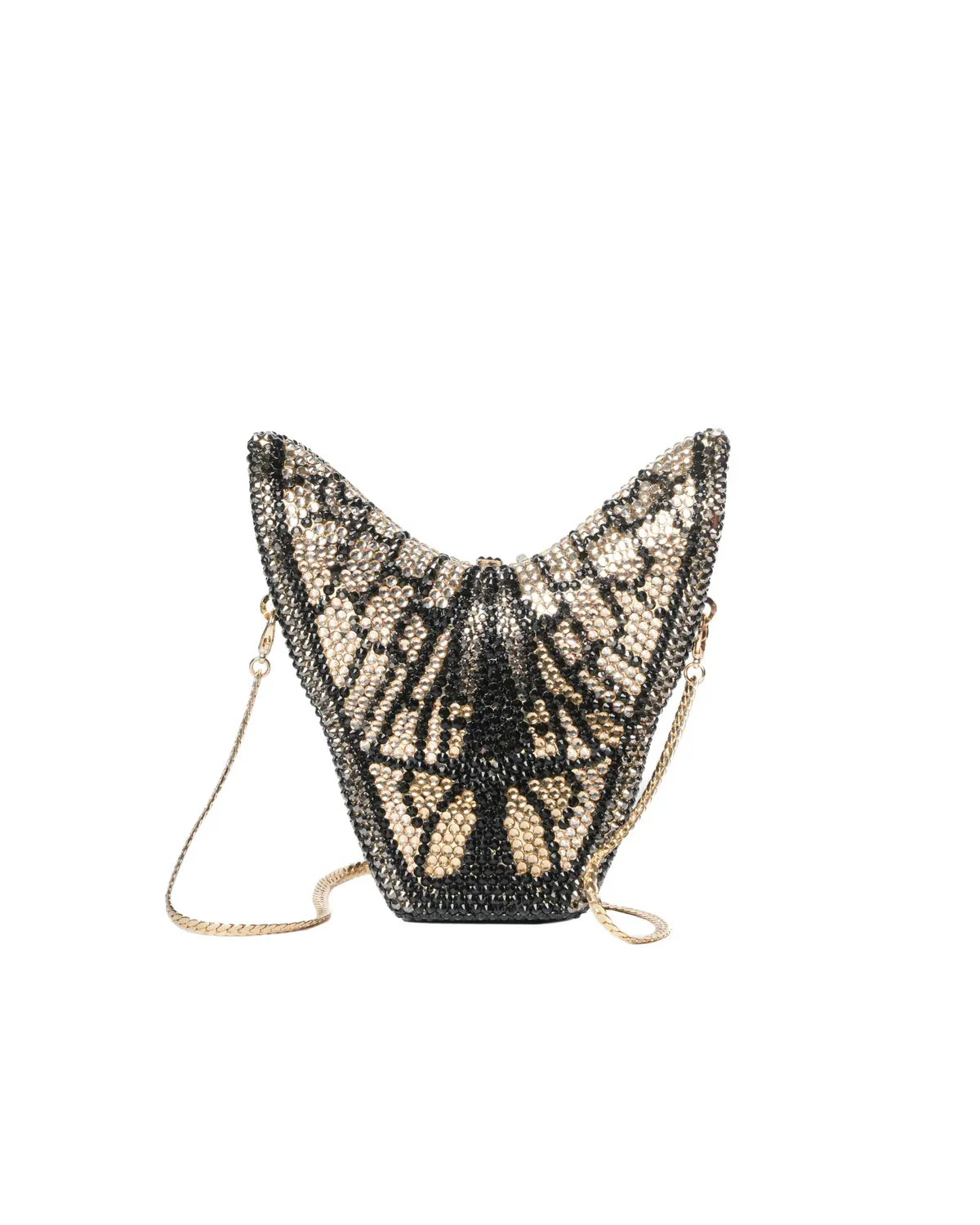 Golden dusk and midnight dreams — Noor-e-Pari in Sunheri Shaam is where elegance meets edge. A hand-embellished butterfly silhouette, studded with premium crystals that shimmer like candlelight. Comes with a detachable handheld chain for effortless day-to-night glamour.