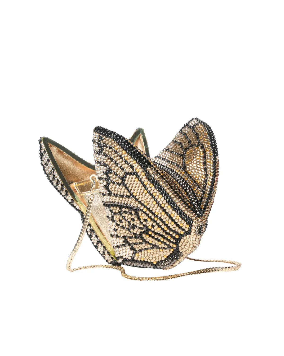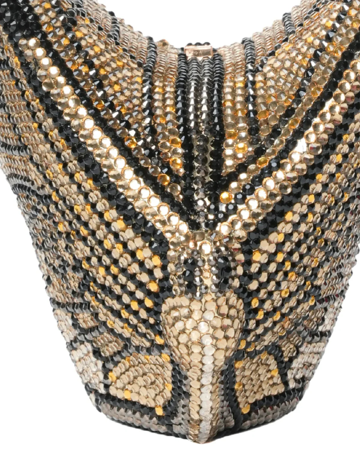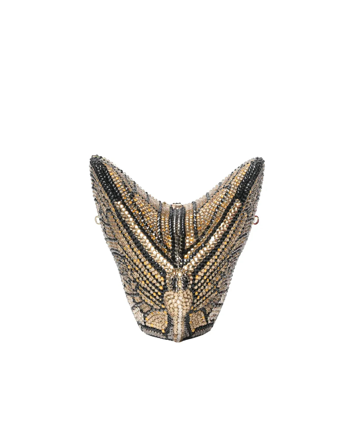 Golden dusk and midnight dreams — Noor-e-Pari in Sunheri Shaam is where elegance meets edge. A hand-embellished butterfly silhouette, studded with premium crystals that shimmer like candlelight. Comes with a detachable handheld chain for effortless day-to-night glamour.